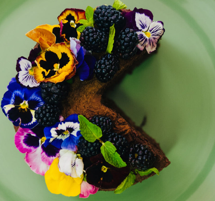3- layered (9”) Decadent chocolate cake is infused with coffee. This perfectly balanced cake has a coffee infused buttercream that pairs well with the smooth cocoa richness of the cake. The structure is an arrangement of edible flowers, fresh berries, decorated with precision, purposefulness to give this cake the elegance, and texture it deserves.